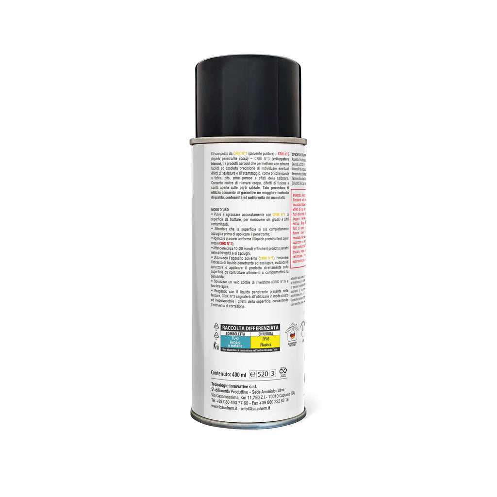 Kit composto da CRIK N1 (solvente pulitore) – CRIK N2 (liquido penetrante rosso) – CRIK N3 (sviluppatore bianco), tre prodotti aerosol che permettono con estrema facilità ed assoluta precisione di individuare eventuali difetti di saldatura o di stampaggio, come cricche dovute a fatica, pits, zone porose e sfiati della saldatura.