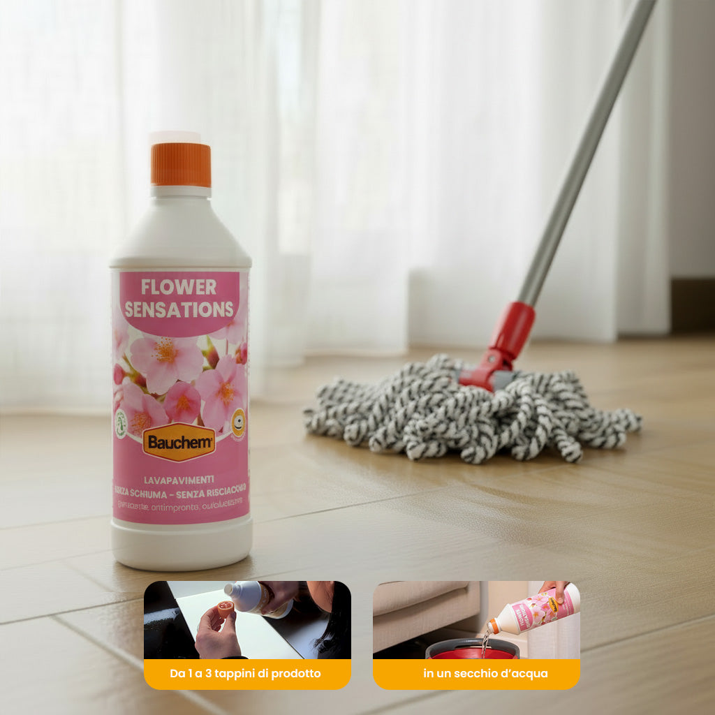 FLOWERS SENSATION. Lavapavimenti igienizzante autolucidante, antimpronte senza risciacquo