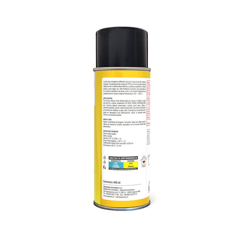 Lubrificante antiadesivo teflonato secco di lunga durata dai molteplici impieghi. Prevalentemente a base di PTFE puro micronizzato, abbassa notevolmente il coefficiente di attrito su qualsiasi superficie in metallo, plastica, vetro, legno, ecc. Non trattiene la polvere, non è dilavabile ed ha un’ottima resistenza ad alcali, acidi, oli e solventi. Mantiene le sue caratteristiche in ampio range di temperatura -60° / +295° C.